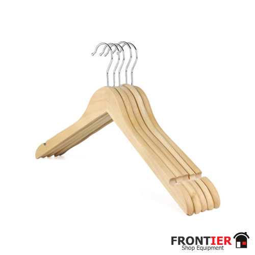 39cm Round Top Wooden Shaped Hanger FR-R1012 x 100 Box of 100 Wooden Shaped Tops Hangers with a rounded top, notches and a metal hook. Product Information 39cm Round Top Wooden Shaped Hanger FR-R1012 x 100