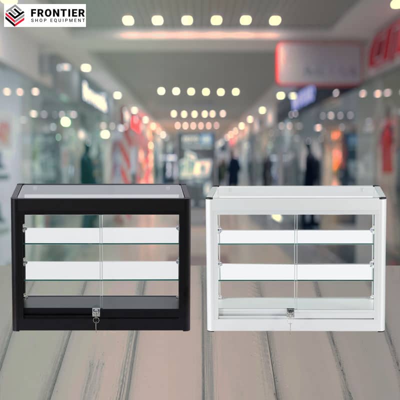 Our modern high visual counter top display cases offer maximuim viewing for your products at eye level. A great choice of shapes & sizes in Black or Silver Aluminium are designed to show your products in a safe and secure way. Our lockable cases are manufactured to the highest quality to ensure lasting durability and will compliment any shop, mobile retail or home environment.