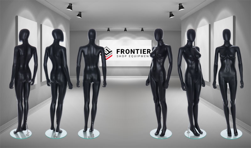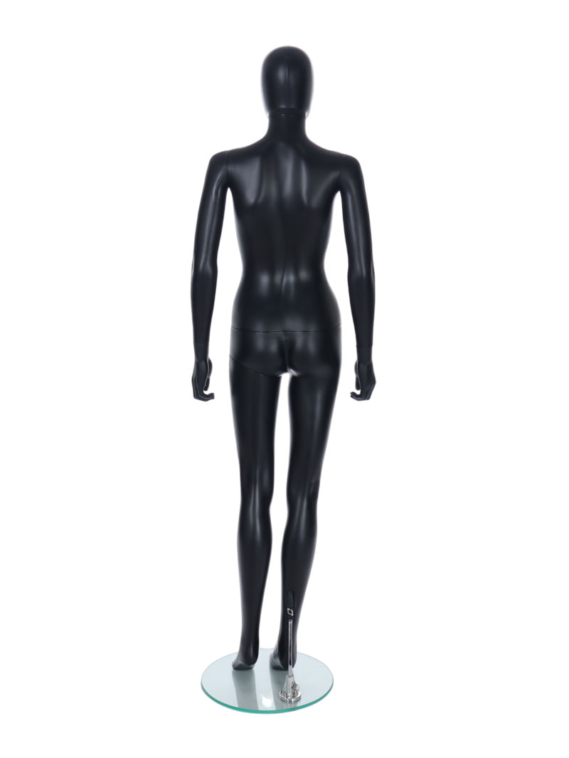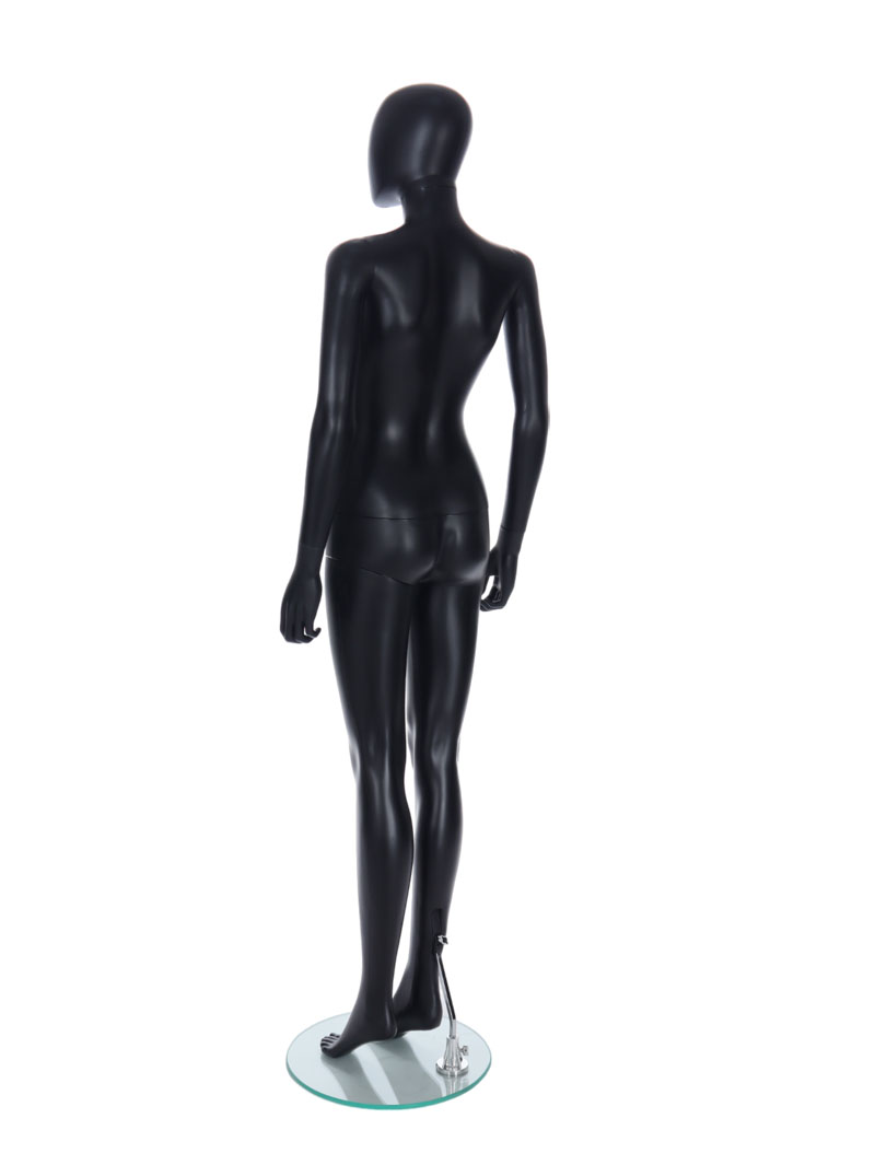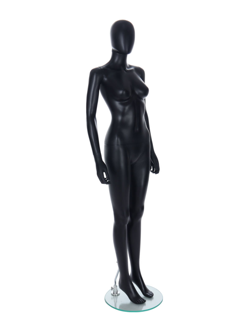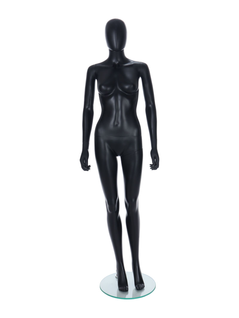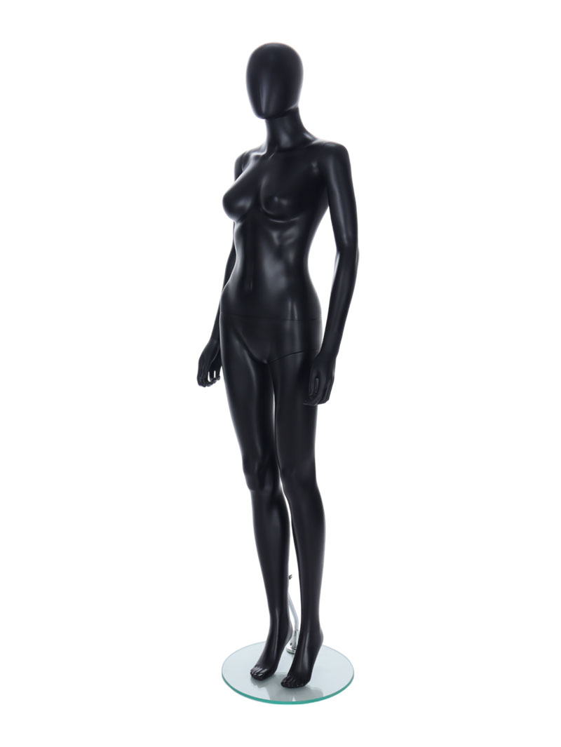 Black female Egg Head mannequin comes with glass stand. Perfect for window displays or instore merchandising.