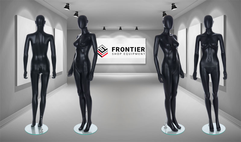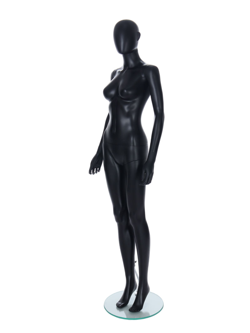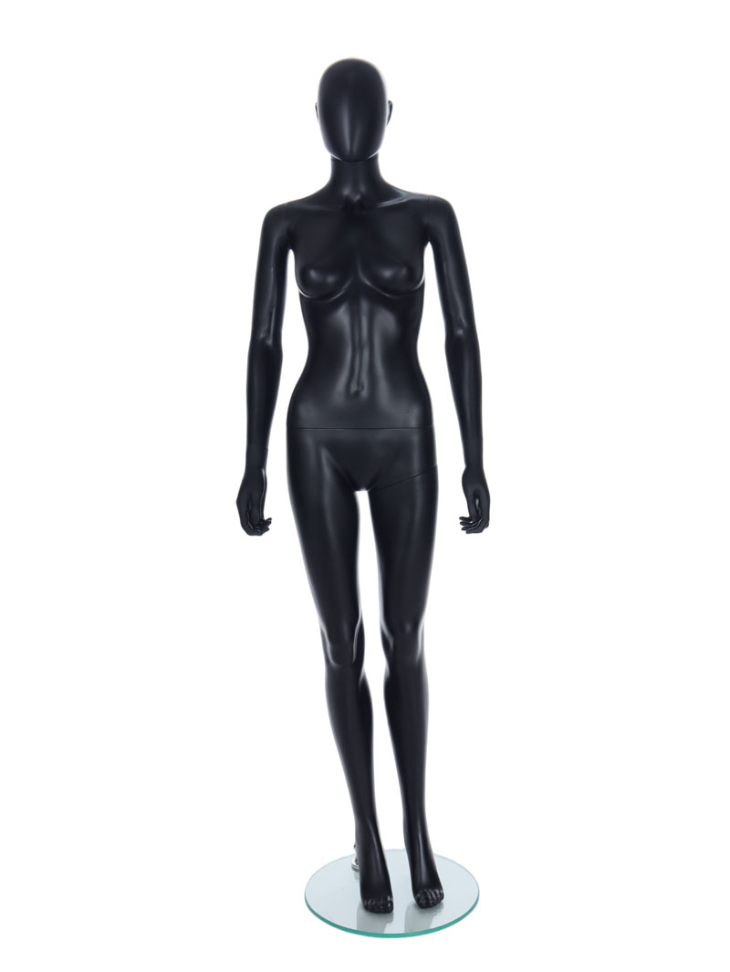 Black female Egg Head mannequin with ears comes with a glass stand. Perfect for window displays or instore merchandising.