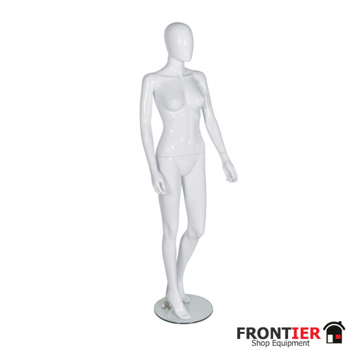 Gloss White female Egg Head mannequin, comes with a glass stand. Perfect for window displays or instore merchandising.