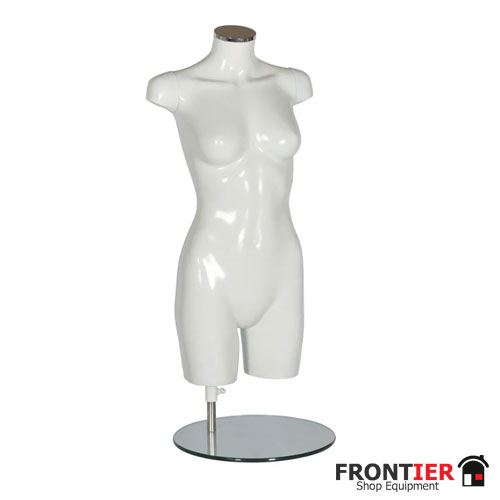 Female Gloss White Headless Torso Mannequin with top cap, Ideal for displaying bikini's, swimwear, strapless tops & shorts etc. Perfect for window displays or instore merchandising.