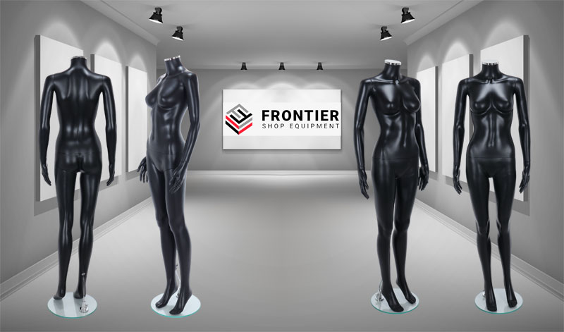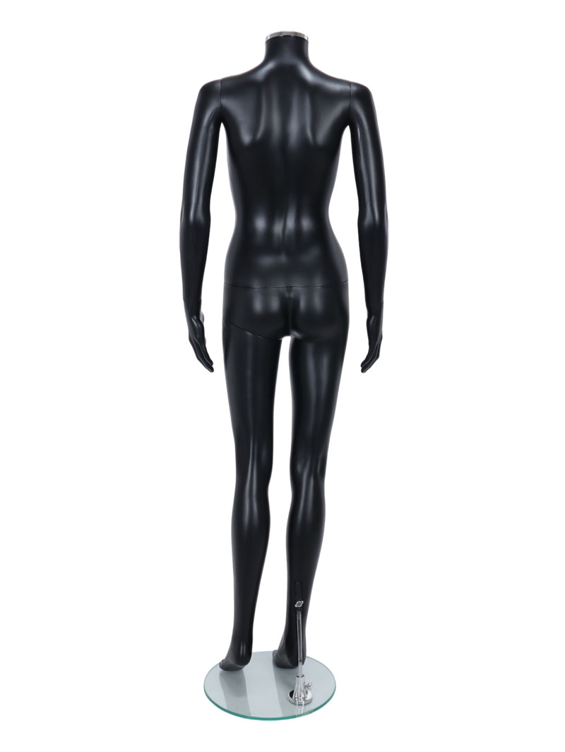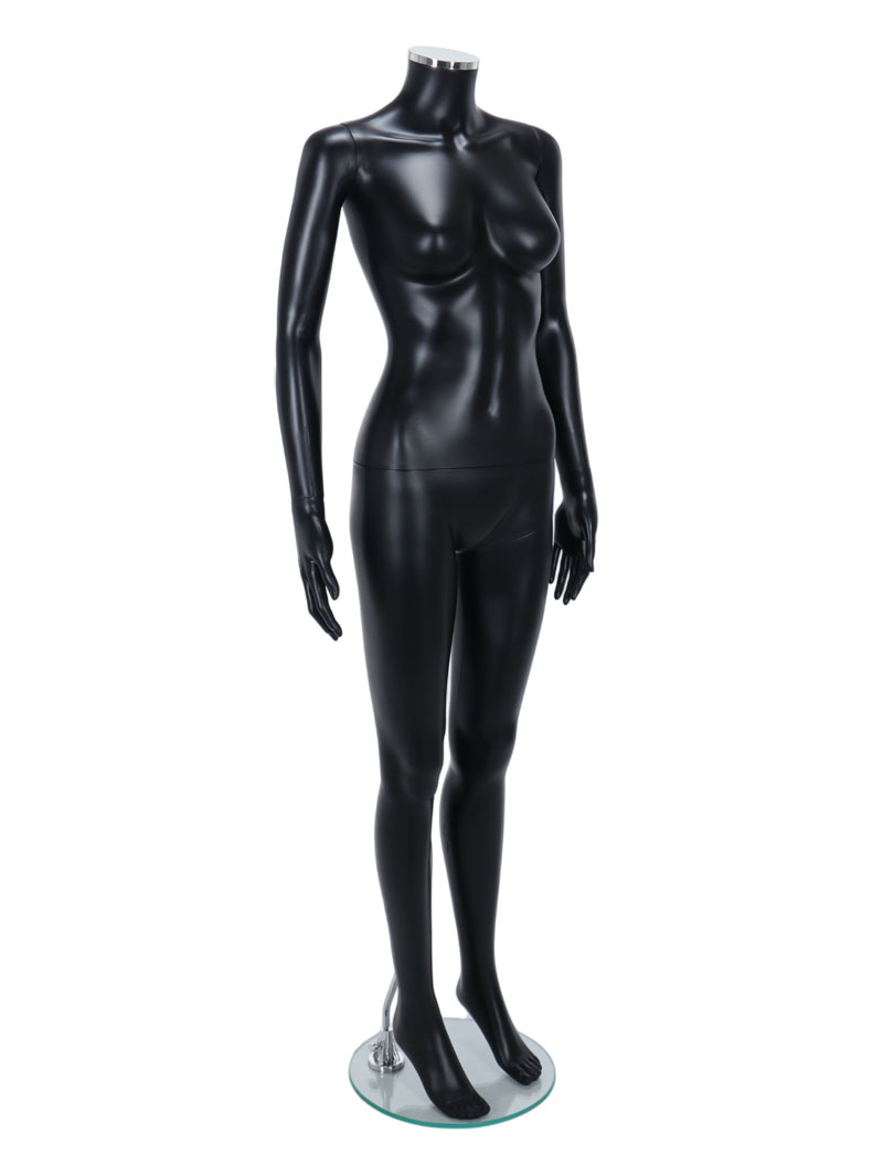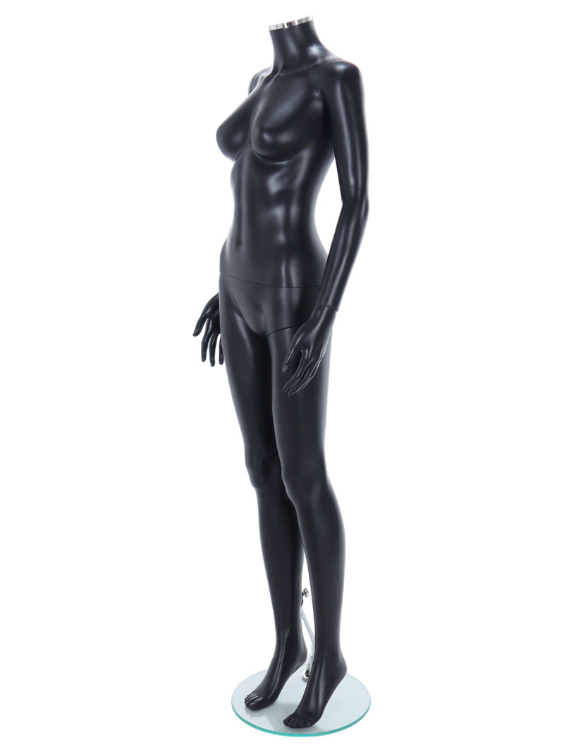 Female Black Headless Mannequin, comes with a chrome top cap & glass stand. Perfect for window displays or instore merchandising.