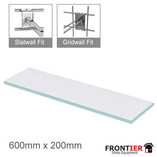 Glass Shelf 600mm x 200mm FR-R762 Glass shelf to fit Slatwall & Gridwall Brackets Display products & items on this sleek glass shelp to entice customers to purchase your products