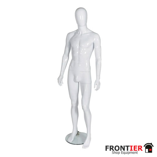 Male Gloss White Egg Head Mannequin, comes with glass stand. Perfect for window displays or instore merchandising.