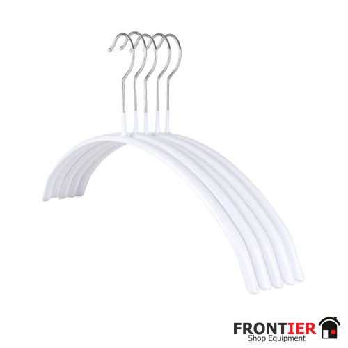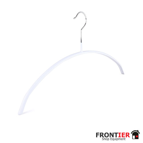 Non Slip Hanger White 36cm FR-R1028 x 100 Pack Non-slip hangers stop garments falling off the hanger which has benefits such as it keeps displays tidy, reduces the time staff spend in tidying displays and can even help deter shoplifters as garments will not slip easily off the hanger into a bag. Non-Slip Curved Knitwear Hangers, 36cm wide and coated in a gloss black rubber finish with a chrome hook. Available in two colours including black and white. Product Information Non Slip Hanger White 36cm FR-R1028 x 100 Pack