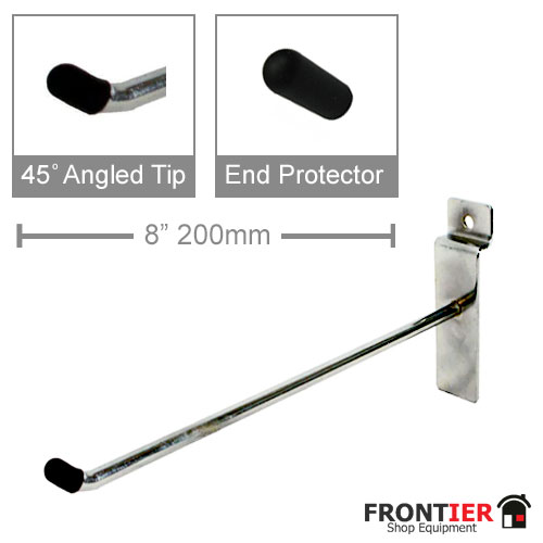 Slatwall 200mm / 8" Straight Hook 45 degree upturn (Box of 100) FR-R504A This Slatwall straight hook in chrome has a black end protector, Perfect for hanging your lightweight items. Product Information Slatwall 200mm / 8" Straight Hook 45 degree upturn (Box of 100) FR-R504A