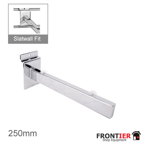 Slatwall 250mm Glass Shelf Brackets FR-R543 This Slatwall Glass Shelf Bracket has a chrome finish and has plastic suckers for your glass shelf to stick to. They are perfect for displaying a huge variety of items. A great addition to your display area. Product Information Slatwall 250mm Glass Shelf Bracket FR-R543