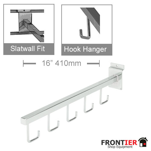 Slatwall 5 Hook Straight Arm FR-R509 This Slatwall 5 hook straight arm comes in chrome, it has a square arm and 5 hooks hang your items on. Ideal for displaying a whole range of items. Product Information Slatwall 5 Hook Straight Arm FR-R509
