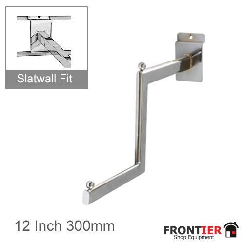 Slatwall Stepped Arm Display FR-R535 This Slatwall Steeped Arm Display allows you to display items on 2 levels. It has a Chrome finish and is perfect for hanging clothing and a variety of other items. A great addition to your display area. Product Information Slatwall Stepped Arm Display FR-R535