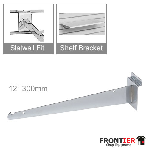 Slatwall Wood Shelf Bracket 300mm FR-R515   This Slatwall Wood Shelf Bracket comes in chrome, it and is designed to hold a 300mm shelf and has a front lip to hold the shelf in place. Ideal for displaying  variety of items.   Product Information   Slatwall Wood Shelf Bracket 300mm FR-R515